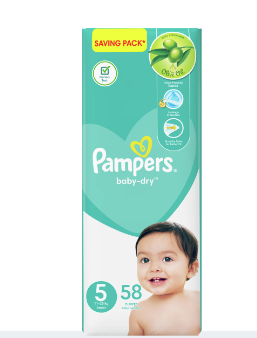 حفاضات بامبرز بيبي دراي 5 حجم جونيور، 11-25 كجم - 58 حفاضة